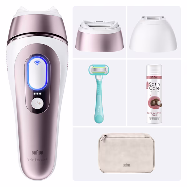 Braun Kit: Luce pulsata Skin i·expert 7, 1 accessorio, rasoio Gillette Venus + gel Satin Care karité