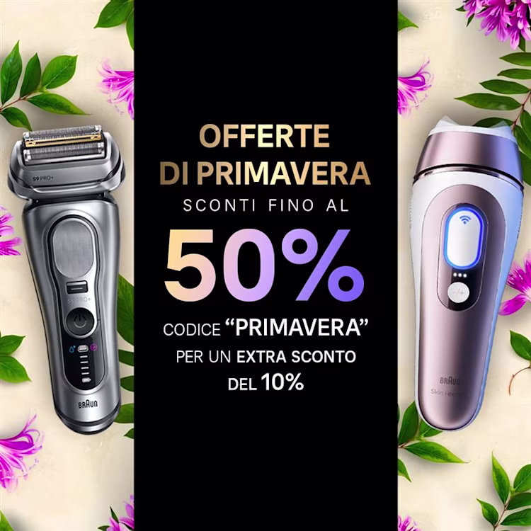 La primavera è il momento perfetto per rinnovare la tua routine di rasatura e bellezza. Dal 23 marzo al 21 aprile, su Braun trovi le Offerte di Primavera esclusive su una selezione di Kit, con sconti fino al 50% e un’extra sconto del 10% con il codice “PRIMAVERA”